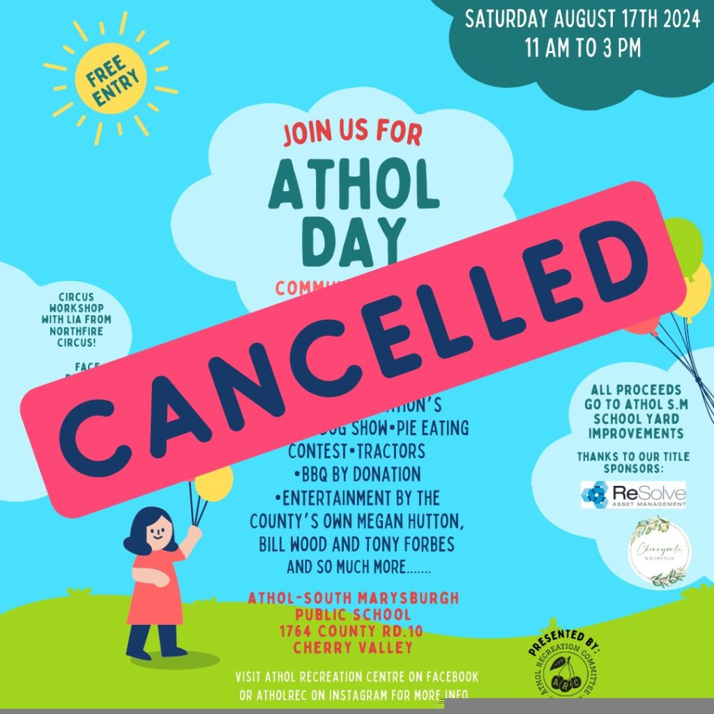 To all our community members, it Is with a heavy heart we have had to make the difficult decision to cancel Athol Day tomorrow.