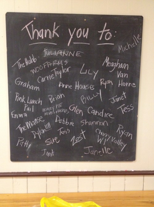 Megan Van Horne for her wonderful raffle cake, the Hubb, The Regent Cafe, Zest, Pink Lunch Pail, Mad Dog Gallery, the Manse, the Hayloft, the Bald Photographer, Honey Pie Hives and Herbs, Comedy Country, Woo Hoo Farms, Cherry Valley Women’s Institute and many, many more!!!!!!
